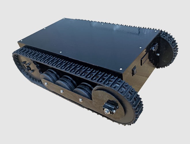 橡膠履帶底盤長(zhǎng)706mm,橡膠履帶底盤寬483mm,橡膠履帶底盤高215mm,無(wú)線航模遙控履帶底盤采用48v350W直流無(wú)刷永磁電機(jī),渦輪蝸桿減速機(jī)動(dòng)力更強(qiáng),轉(zhuǎn)彎靈活,操控簡(jiǎn)單。履帶底盤電池采用48V30AH鋰電池續(xù)航時(shí)間更長(zhǎng)。履帶底盤箱體采用鋼板焊接而成,輪系采用高分子聚乙烯,履帶底盤整體重量輕,耐磨性強(qiáng)。